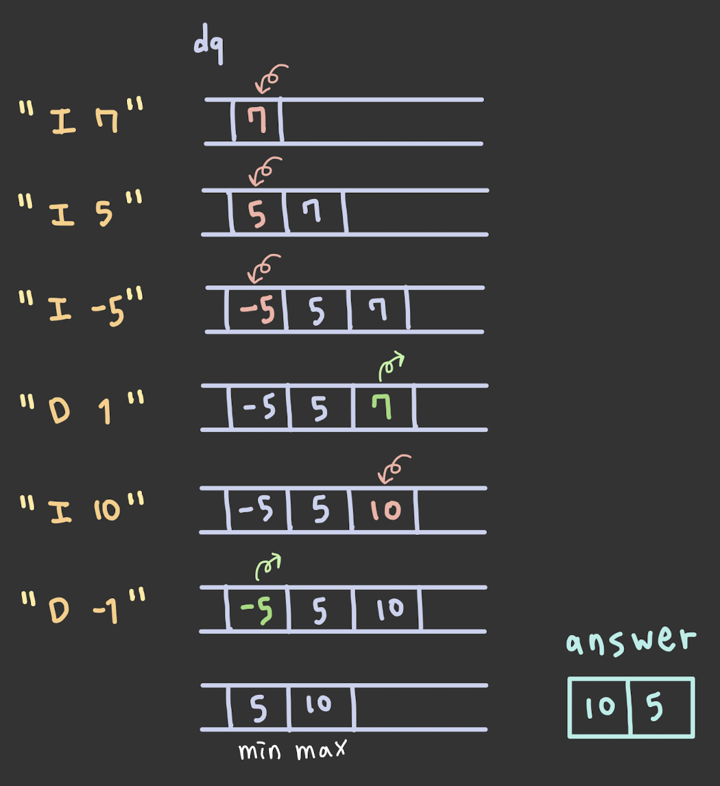- 원소는 “명령어 데이터” 형식으로 주어집니다.- 최댓값/최솟값을 삭제하는 연산에서 최댓값/최솟값이 둘 이상인 경우, 하나만 삭제합니다.