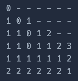 m[i][j]는 i번째로 노드 j에 도달하기 위한 수정 횟수를 의미한다. 연결된 노드에 자기 자신을 추가하는 이유는 이동하지 않고 그대로 머무르는 경우를 고려하기 위해서다. 하지만 이 부분을 추가하지 않아도 통과가 되었다.