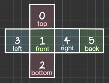 큐브의 각 칸에 주어진 수에 따라 다음과 같이 각 면에 번호를 부여했다. 같은 색으로 칠해진 두 면은 서로 마주 보는 면이다.