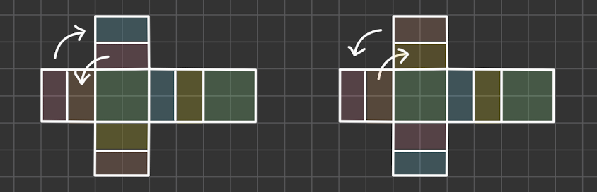 루빅스 큐브를 정확히 한 번 돌려서 풀 수 있는 경우는 다음의 6가지 밖에 없다. 한 쌍의 마주보는 면이 같은 색으로 맞춰져 있고, 나머지 면들은 돌리는 방향에 따라 인접한 두 칸이 같은 색이어야 한다. 이 경우 화살표 방향으로 큐브를 돌려 풀 수 있다.