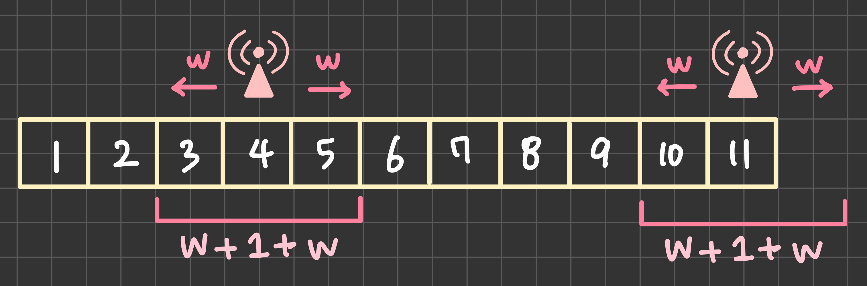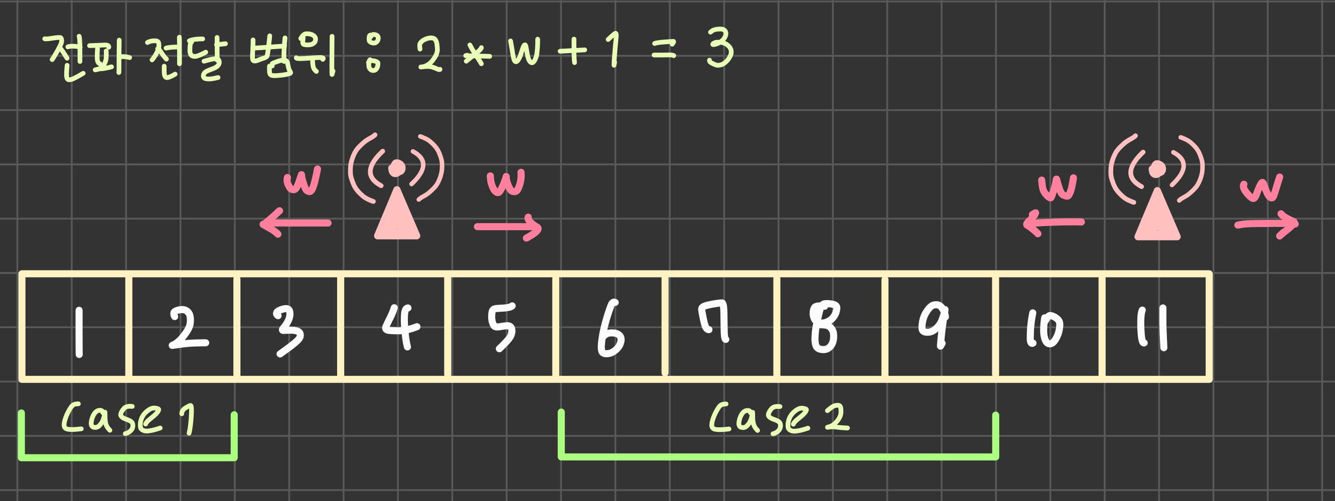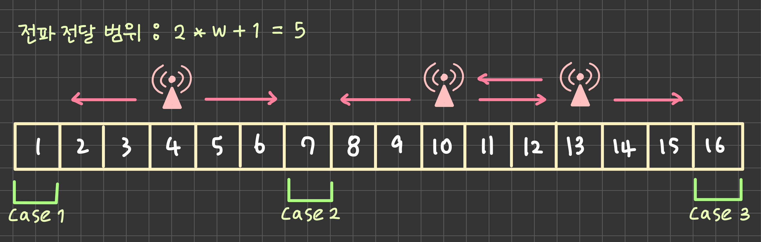 전파의 도달 거리가 W일 때, 하나의 기지국은 다음과 같이 (2 * W + 1)만큼의 아파트에 전파를 전달할 수 있다.