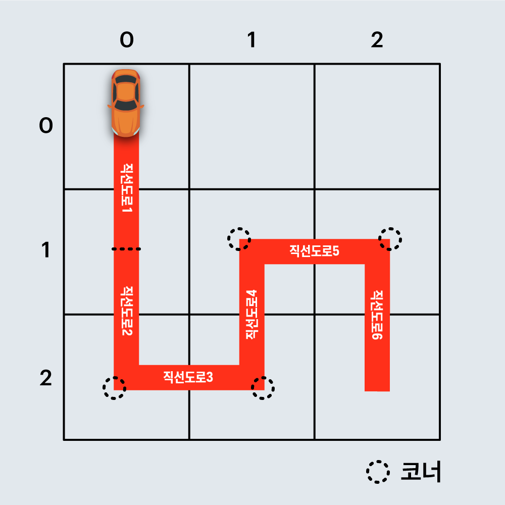 또한 두 직선 도로가 서로 직각으로 만나는 지점을 코너 라고 부릅니다.