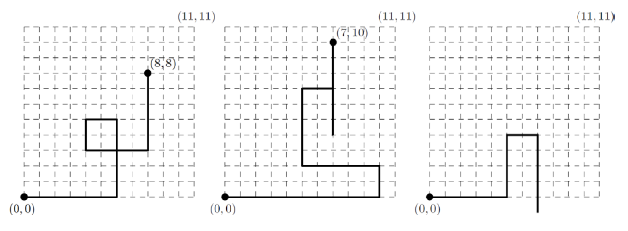 예를 들어 로봇이 왼쪽 그림과 같이 (MOVE 6, TURN 0, MOVE 5, TURN 0, MOVE 2, TURN 0, MOVE 2, TURN 0, MOVE 4, TURN 0, MOVE 3, MOVE 2) 명령어를 읽어 들인다면, 최종적으로 로봇은 (8, 8) 위치에 있게 된다. 가운데 그림과 같이 (MOVE 10, TURN 0, MOVE 2, TURN 0, MOVE 5, TURN 1, MOVE 5, TURN 1, MOVE 2, TURN 1, MOVE 3, TURN 0, TURN 0, MOVE 6) 명령어를 읽어 들인다면, 로봇은 (7, 10)에 위치하게 된다. 오른쪽 그림과 같이 로봇이 S 바깥으로 나간다면, 명령어 열은 유효하지 않다.