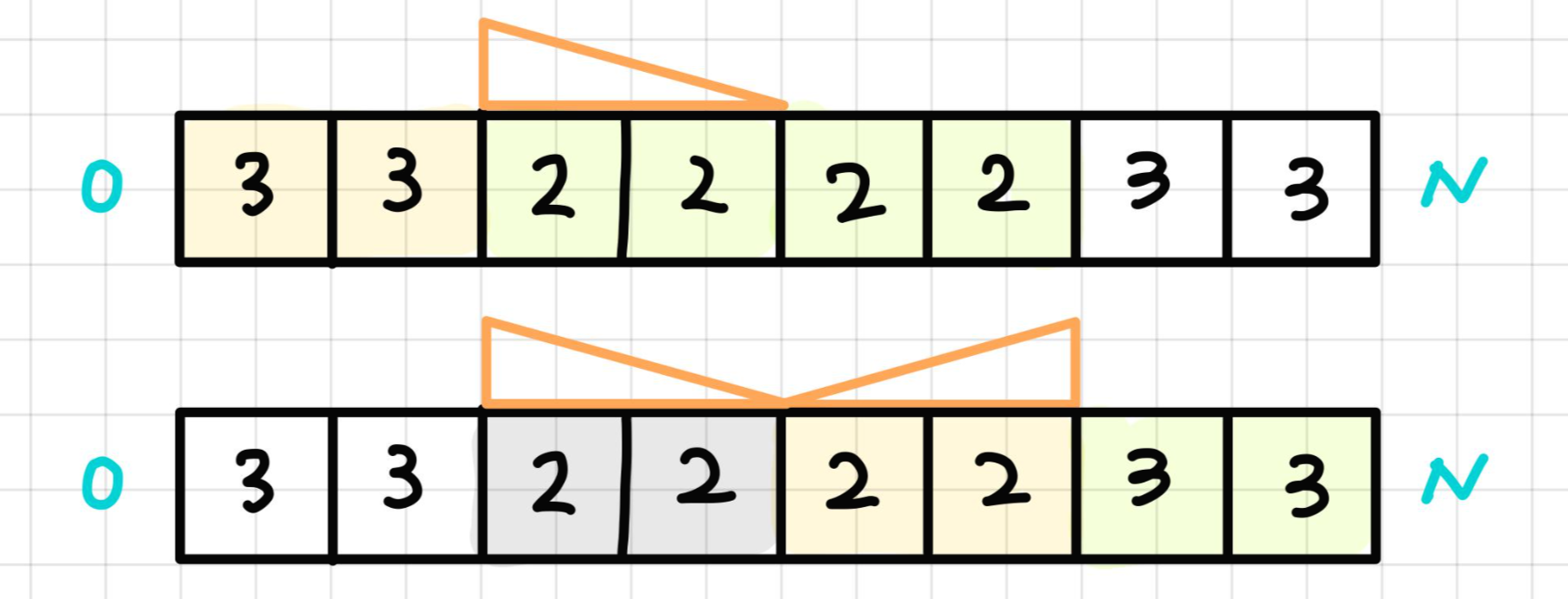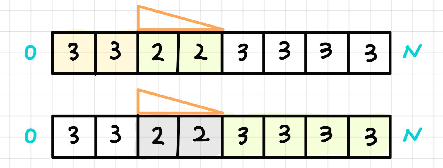 모든 행과 열에 대해 경사로를 놓아 지나갈 수 있는지 확인해야 한다. check() 함수에서 하나의 행 또는 열을 지나갈 수 있는지 확인할 수 있다. 반복문을 통해 인접하고 높이가 다른 칸들에 대해 경사로를 놓아 지나갈 수 있는지 확인한다. 다음은 N = 8, L=2일 때의 수행 예시이다. 노란색 칸은 a와 cnt1에 해당하고 초록색 칸은 b와 cnt2에 해당한다.