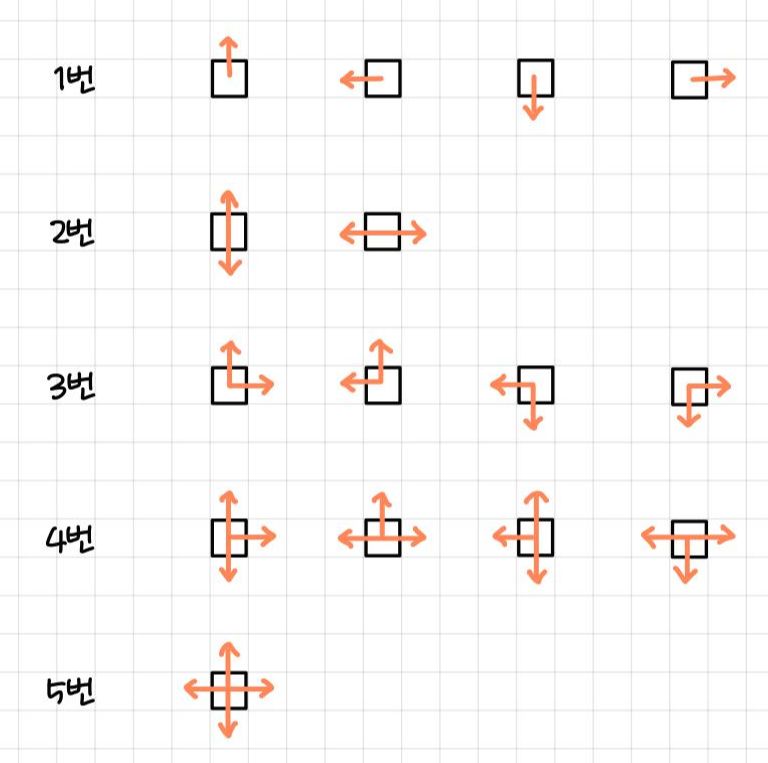 1번 CCTV는 한 쪽 방향만 감시할 수 있다. 2번과 3번은 두 방향을 감시할 수 있는데, 2번은 감시하는 방향이 서로 반대방향이어야 하고, 3번은 직각 방향이어야 한다. 4번은 세 방향, 5번은 네 방향을 감시할 수 있다.