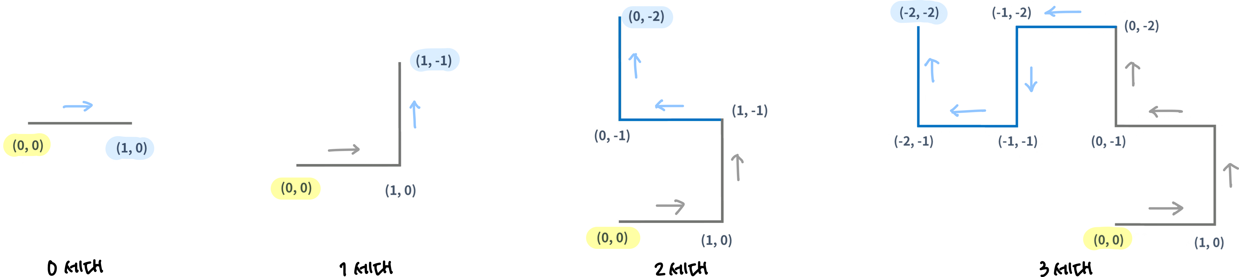 즉, K(K > 1)세대 드래곤 커브는 K-1세대 드래곤 커브를 끝 점을 기준으로 90도 시계 방향 회전시킨 다음, 그것을 끝 점에 붙인 것이다.