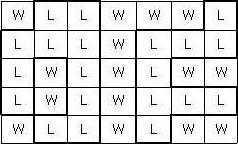 보물섬 지도를 발견한 후크 선장은 보물을 찾아 나섰다. 보물섬 지도는 아래 그림과 같이 직사각형 모양이며 여러 칸으로 나뉘어 있다. 각 칸은 육지(L)나 바다(W)로 표시되어 있다. 이 지도에서 이동은 상하좌우로 이웃한 육지로만 가능하며, 한 칸 이동하는 데 한 시간이 걸린다. 보물은 서로 간에 최단 거리로 이동하는데 있어 가장 긴 시간이 걸리는 육지 두 곳에 나뉘어 묻혀있다. 육지를 나타내는 두 곳 사이를 최단 거리로 이동하려면 같은 곳을 두 번 이상 지나가거나, 멀리 돌아가서는 안 된다.