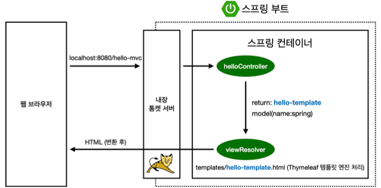 ViewResolver가 템플릿을 찾아서 템플릿 엔진에 넘기면 템플릿 엔진이 렌더링해서 완성된 HTML을 내려준다.